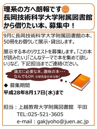 9月に長岡技術科学大学附属図書館の本、50冊をお借りして展示・貸出します。展示する本のリクエストを募集します。平成28年8月17日(水)まで に、「この本が読みたい」「こんなテーマで本を集めて欲しい」など、gakjyoho★juen.ac.jp(★を@に変えてください)…